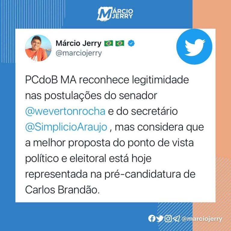 “PCdoB MA reconhece legitimidade nas postulações do senador Weverton Rocha e do secretário Simplício Araújo , mas considera que a melhor proposta do ponto de vista político e eleitoral está hoje representada na pré-candidatura de Carlos Brandão'”, disse Jerry.