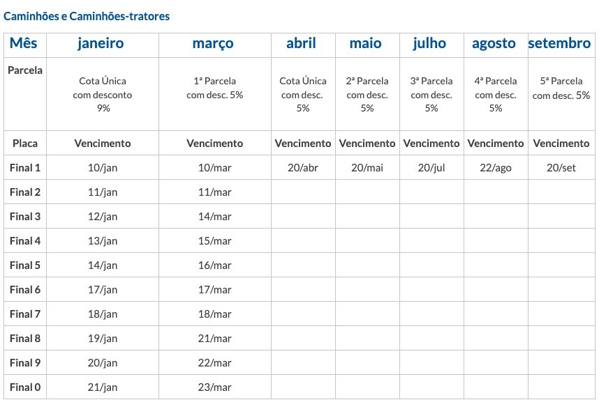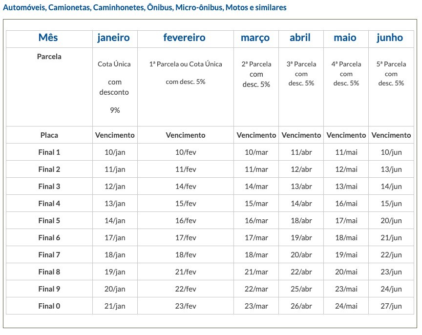 As datas para efetuar o pagamento em fevereiro começa na próxima quinta-feira (10) e vai seguir os finais das placas dos veículos. Segue tabela completa para veículos usados.