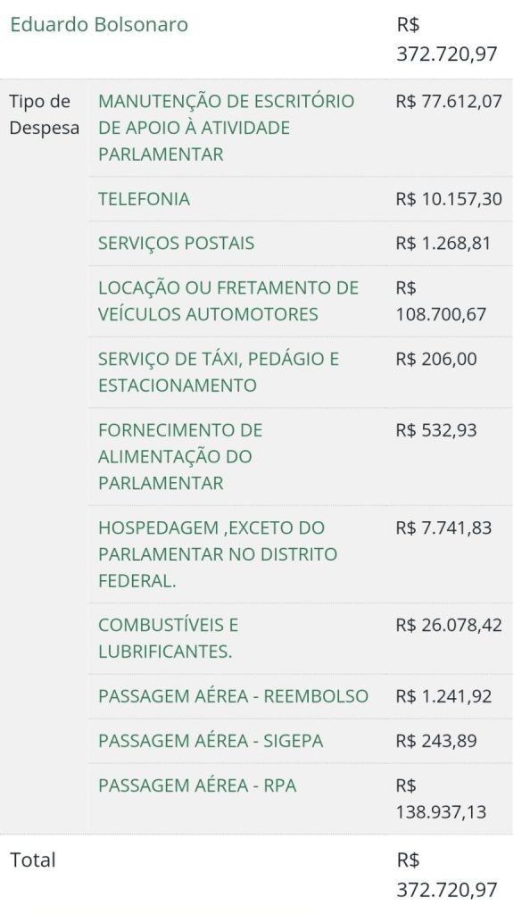 Esta semana, prints da lista de despesas de Eduardo Bolsonaro, pagas com dinheiro público, deixou os brasileiros assustados. Para se ter uma ideia, só com telefonia, Dudu Bananinha gastou R$10 mil reais. Com combustível, foram gastos R$26 mil reais, o equivalente para comprar quase 5 toneladas de óleo diesel e aproximadamente 4 toneladas de gasolina. Com locação de veículos, Eduardo Bolsonaro gastou mais de R$108 mil reais, tudo pago com dinheiro público. Veja a lista completa abaixo.
