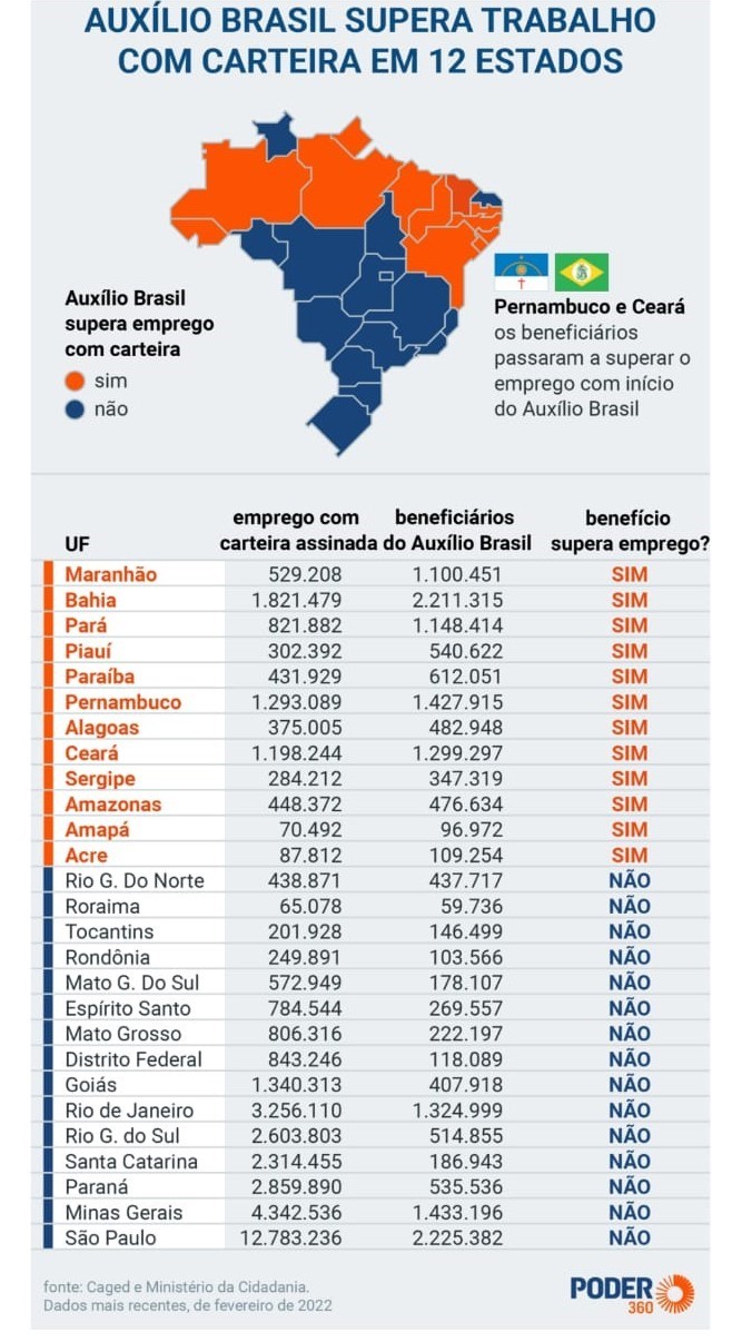 Tabela com a lista de dependentes de auxílio por estado; Maranhão, como sempre, na primeira posição da dependência