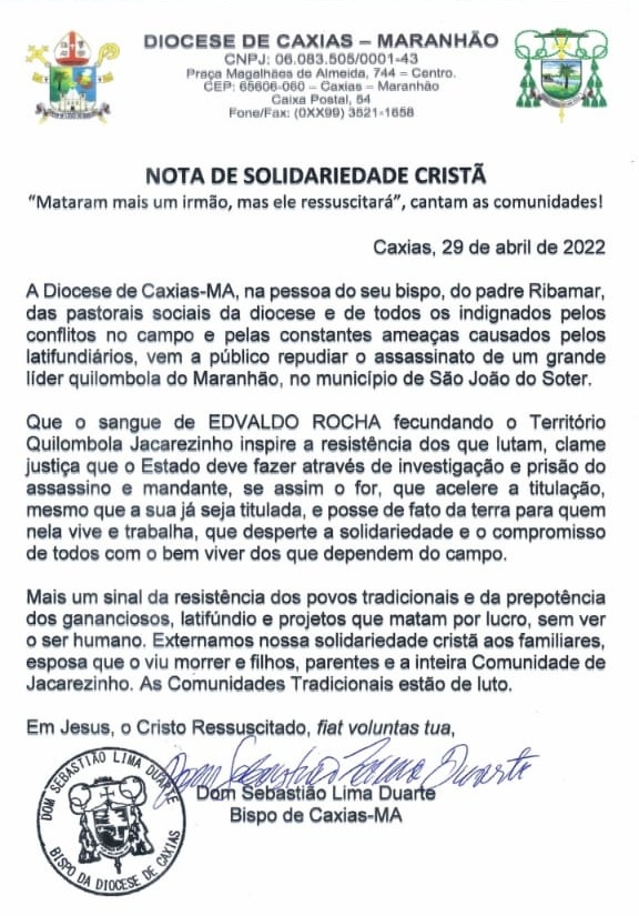 Diocese de Caxias emitiu uma nota para repudiar o assassinato do líder quilombola Edvaldo Pereira Rocha. O crime aconteceu na manhã dessa sexta-feira (29) em São João do Sóter.