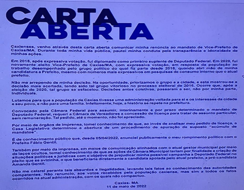 O vice-prefeito de Caxias, Paulo Marinho Jr.(PL), renunciou ao cargo de vice-prefeito de Caxias. “Agradeço a confiança dos caxienses. Renuncio apenas este mandato, mas não o povo da minha cidade, o trabalho continua”, disse.