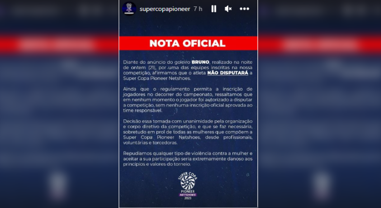 "Decisão essa tomada por unanimidade pela organização e corpo diretivo da competição, e se faz necessária sobretudo em prol de todas as mulheres que compõem a Super Copa Pioneer Netshoes, desde profissionais, voluntárias e torcedoras. Aceitar a sua participação seria extremamente danoso aos princípios e valores do torneio", disse.