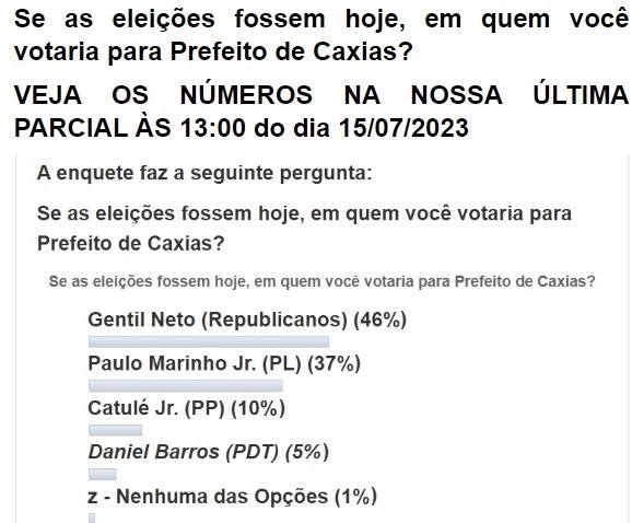 A mais recente enquete mostra favoritismo para o candidato Gentil Neto, que estaria em vantagem desproporcional em relação a Paulo Marinho Jr., Catulé Jr. e Daniel Barros, que também são pré-candidatos à prefeitura de Caxias.