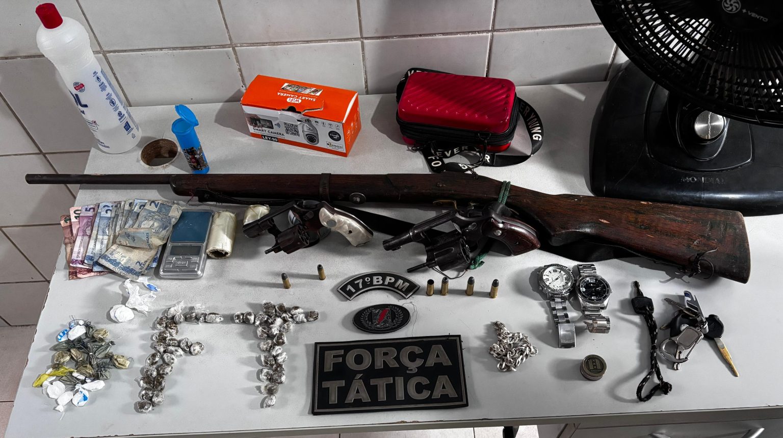 Na casa de Guilherme, os policiais apreenderam 46 porções de cocaína, uma espingarda bate-bucha, uma balança de precisão, R$ 64 em dinheiro e uma moto Honda Pop. Ele confessou o crime e disse ter usado um revólver calibre 38 emprestado por Luiz Felipe Cantanhede Teixeira.