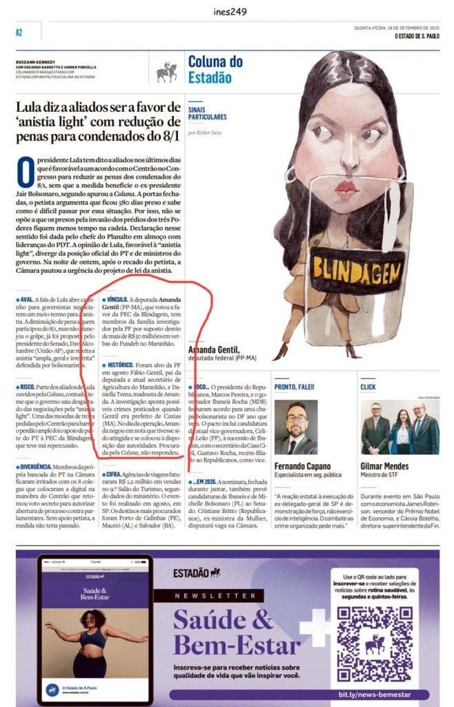 Do Fundeb ao Escândalo: R$ 50 Milhões que Nem a Blindagem Vai Esconder Uma charge do artista Kleber Sales, publicada na Coluna do Estadão, mostrou aquilo que milhares de maranhenses já enxergam: Amanda Gentil (PP-MA) não está com um escud