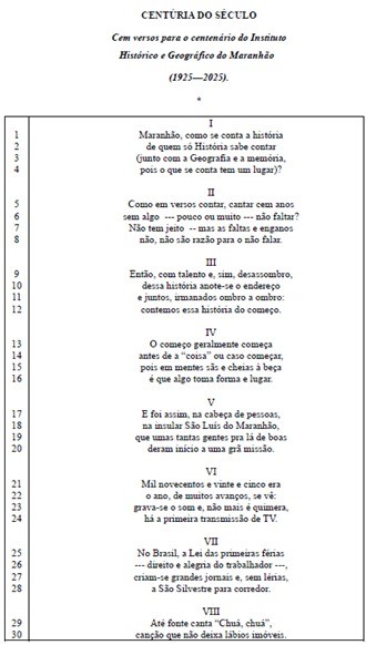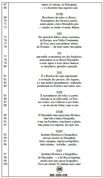 O trabalho premiado de Edmilson Sanches chama-se “CENTÚRIA DO SÉCULO - Cem versos para o centenário do Instituto Histórico e Geográfico do Maranhão (1925—2025)” (ver imagens). A Comissão Julgadora foi formada por Elizabeth Sousa Abrantes, pós-doutora e professora do Departamento de História da Universidade Estadual do Maranhão (UEMA); Iran de Jesus Rodrigues dos Passos, jornalista, doutor em Letras, professor do Departamento de Letras da UEMA; Sandra Regina Rodrigues dos Santos, pós-doutora, professora do Departamento de História e do Programa de Pós-Graduação em História da UEMA; e José Dino Costa Cavalcante, doutor em Letras, professor do Departamento de Letras da Universidade Federal do Maranhão (UFMA).