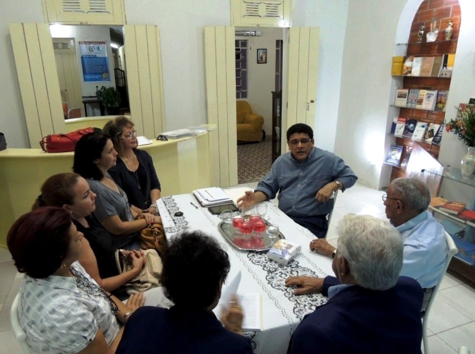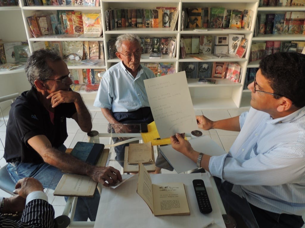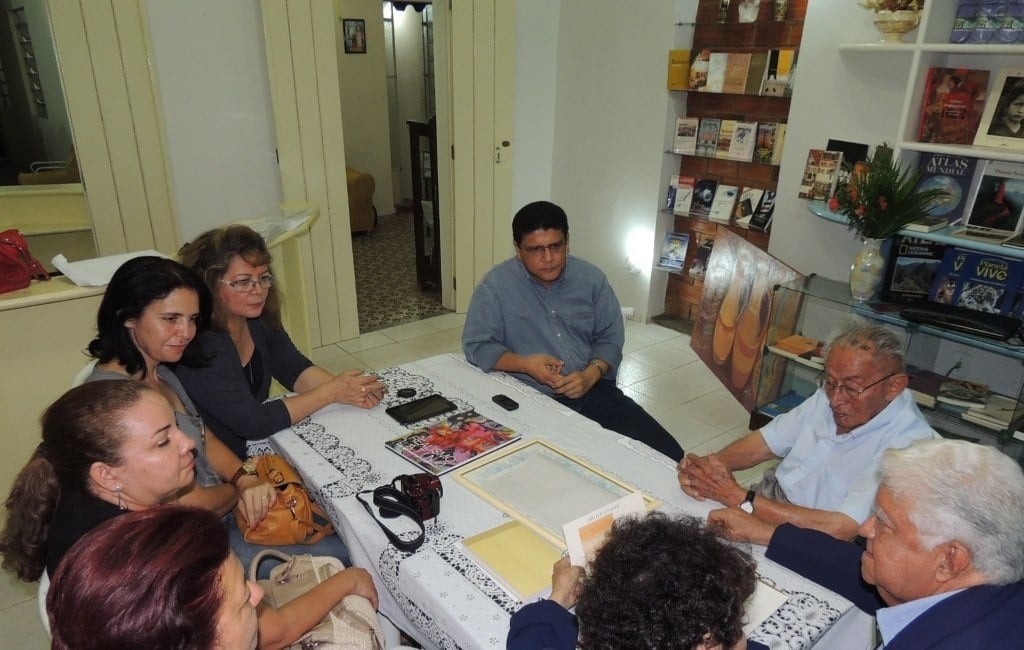 À direita, de óculos e camisa clara, Seu Francisco Félix Costa, em reunião no Espaço Cultural Gonçalves Dias (que já encerrou as atividades), com Arthur Almada Lima Filho (falecido em outubro de 2021); sua filha Ana Maria; a jornalista Marilene Moraes e as professoras Antônia Miramar Alves Silva, Mercilene Barbosa e Erlinda Maria Bittencourt; e Edmilson Sanches (que está falando na terceira foto, observado por Seu Francisco Félix).