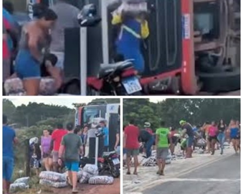 Vídeo: Carreta carregada de arroz tomba na BR-226, Barra do Corda, e carga saqueada por populares.