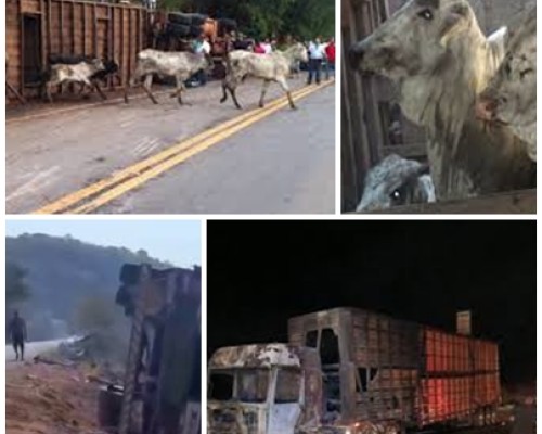 Paraibano: CARRETA COM BOIS CAPOTA E PARTE DA CARGA É CARBONIZADA NA BR-135 EM PARAÍBANO; MOTORISTA SOBREVIVE