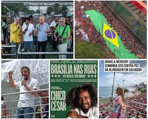 Brasil: VÍDEO - Atos contra anistia e PEC da Blindagem reúnem manifestantes em várias capitais - Chico, Gil, Caetano, Daniela Mercury e Chico César
